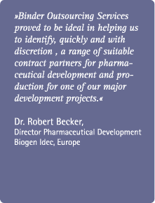 0 Binder Outsourcing Services for the pharmaceutical and biotech industry We specialize in finding and evaluating • Contract Manufacturers • Contract Research Organizations • Technologies Worldwide, independent and discrete. We understand research and development and we know the requirements for successful outsourcing in the pharmaceutical industry. Our experience, our specialized databases and network will help you to find the technology, service providers and manufacturers who fulfill your project criteria. Moreover, we are independent. We only receive payment from our clients and do not take any finder fees from other companies. Our clients are well known pharmaceutical and biotechnology companies. Should you wish to see some references, please do not hesitate to contact us. |